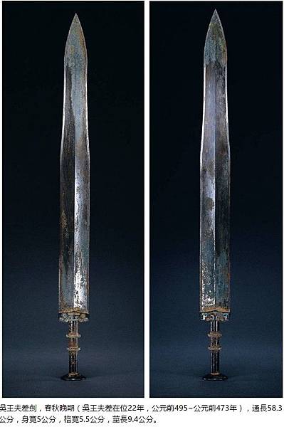 吳王夫差劍,春秋晚期(吳王夫差在位22年,公元前495~公元前473年),通長58.3公分,身寬5公分,格寬5.5公分,莖長9.4公分。