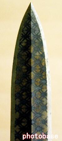 鋁、鐵、鎳、硫組成的青銅合金,劍身的黑色菱形花紋是經過硫化
