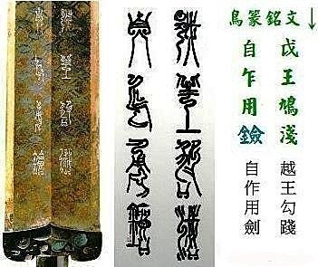 鸟虫篆(越王勾践,自作用剑)青銅器銘文(越王勾踐劍銘)鳥蟲篆,篆體之一,又稱“鳥蟲書”,其筆劃屈曲如蟲,畫首或飾以鳥狀而得名。