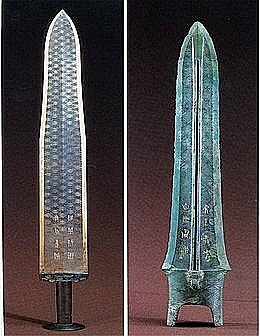 中國古代由青銅制成的劍身很薄,質地脆,很容易折斷,只適刺殺而不適劈砍,因此當時人們把劍稱為"直兵"。