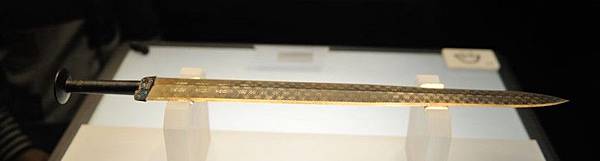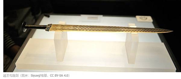 「越王勾踐劍」是把長55.6釐米、寬4.6釐米的青銅劍,劍身滿佈黑色菱格紋;