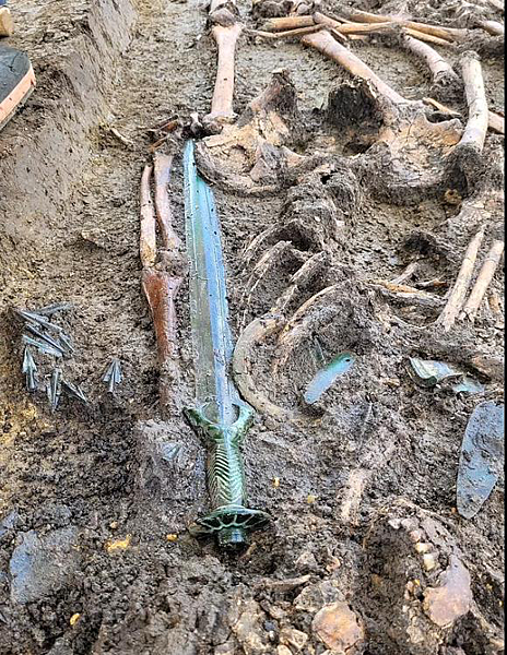 據了解,這把劍有著八角形刀柄,位置在於一個三人墓穴,墓中包括一名男子、一名女子和一名小男孩,猜測三人死後被青銅器物快速連續埋葬。目前尚不清楚這三人間的關係。