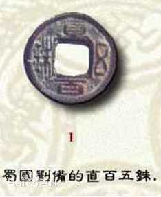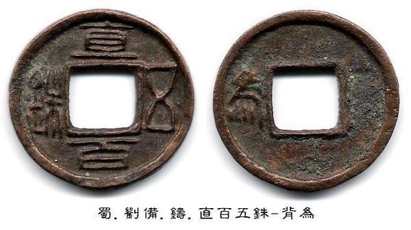漢獻帝建安十九年(公元214年),劉備初據成都,軍需孔急,無暇另作新范,乃挑蜀錢舊范厚重者,加刻[直百]二字鑄造應急.故[五銖]為小篆舊銘文,[直百]則新書遵隸法.而一錢面文二字體,以此開先例.初期鑄品,徑2.7公分弱,法重八銖,約6.4公克.外輪內敦,獨具粗獷闊大的特色.然而[蜀漢]國處邊陲,人口寡稀,又征戰連連,國庫歲賦常感不足,通貨膨脹自然無法避免.[直百五銖]錢,也由最初的6公克以上之厚實型,減重成4至5公克,文字低平之輕薄型.孔明去世後,更減至3公克以下,幾近小平錢.至於小平錢,如[蜀五銖].[傳形五銖].[太平百錢]等,更是減重到成為1公克左右的小錢.
