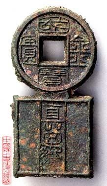新朝王莽時期所鑄錢幣,字體優美、鑄工精良、造型別緻,如大泉五十、一刀平五千等都是珍品;其中有一款神秘的錢幣,造型奇特,上呈方孔圓形,書“國寶金匱”四字,下呈長條方形,書“直萬”二字,被古錢幣投資收藏者稱“國寶金匱直萬”,價值無可估量。