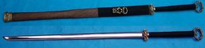 2、山東蒼山發現的一把記有年銘的長刀,全長111.5厘米,刀脊的厚度與刀身的寬度相比,大約是1/3,刀身上有錯金的火焰篆紋,並且有十八個錯金隸書刀銘:“永初六年五月丙午造卅涑大刀吉祥宜子孫。”由此可知這把刀是漢安永初六年(公元112年)造成的,此刀現今保存在中國歷史博物館內,它和我們現用的苗刀(漢刀)一模一樣。經過鑒定,此刀是以含碳較高的沙鋼為原料,經過反複多次鍛打而成。銘文中的“卅涑”即是“卅煉”,可能代表著一定的工藝質量標準。此刀的發現,有力地說明了苗刀源于中國,是我們中華民族的寶貴文化遺産。