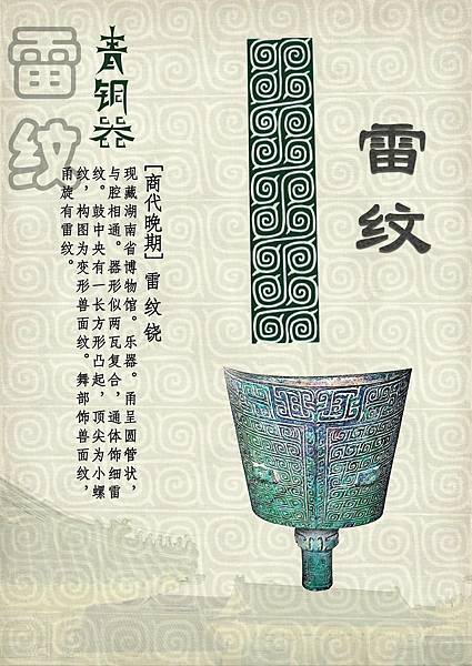 雲雷紋是商周青銅器中出現機率最高的幾何形紋飾,最常見的形象是由細或粗的線條構成連續的螺旋形。螺旋形作圓形者,通稱為雲紋;作方形者,通稱為雷紋,但實際上由於兩者區別並不明顯,或有方、圓兼用,故有時通稱為「雲雷紋」。 |