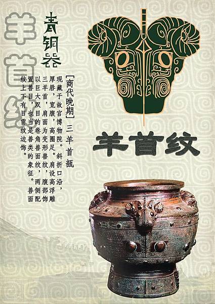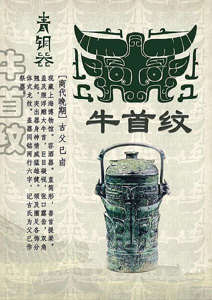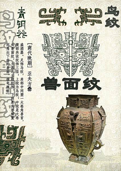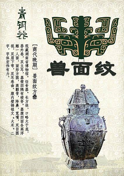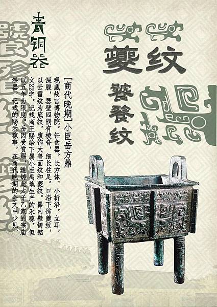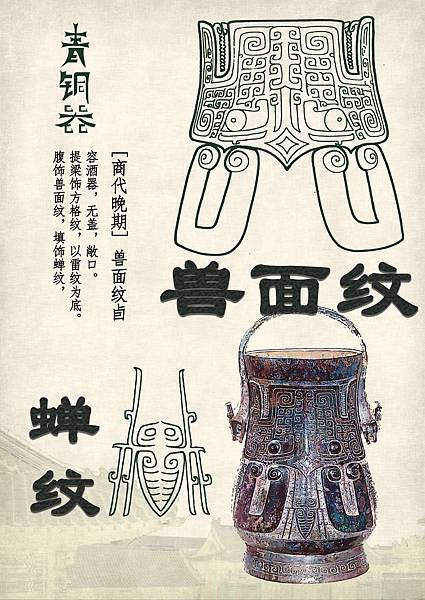獸面紋(饕餮紋)是二里崗時期至西周早期盛行的紋飾,常被裝飾於器物的主要部位。獸面紋衰落後並未消失,而是常出現在器物的耳、足部。完整的獸面紋有目、眉、角、鼻、耳、軀幹、尾、腿、足等部分,但在應用上常有簡省或變形。 |