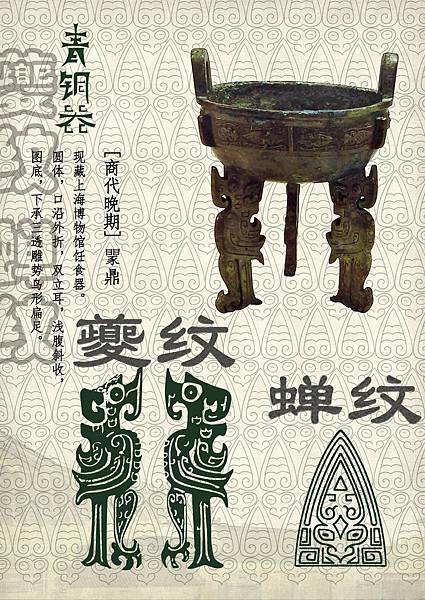 蟬紋共同特徵是大眼睛、軀體作長三角形,上部作圓角,腹部有條紋。流行於商代晚期至西周早、中期。蟬紋可橫置,組成帶狀作為器物上的主紋飾。 |