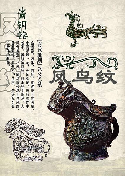 鳳鳥紋是指鳥紋形體較大,在青銅器上作為主題紋飾存在的紋飾,往往鑄於器腹等主要部位。始見於商代晚期,盛行於西周早、中期,之後便逐漸衰落。基本構造有冠、首、身、尾等部分,十分華麗。 |
