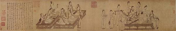 畫面有三組人物,居中的是坐在榻上的四位士大夫,或展卷沉思,或執筆書寫,或欲離席,或挽留者,神情生動,細節描寫也很精微,旁邊站立服侍的女侍也表現得各具情致。此畫用筆細勁流暢,設色簡樸優美,畫風雖難免受宋人影響,但與北齊婁睿墓壁畫畫風有異曲同工之妙。