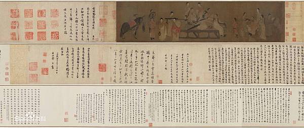 其中局部圖,為四位士大夫坐在榻上,或展卷沉思,或執筆書定,或欲離席,或挽帶留之,神情均極為生動,細節描寫,具盡細微。