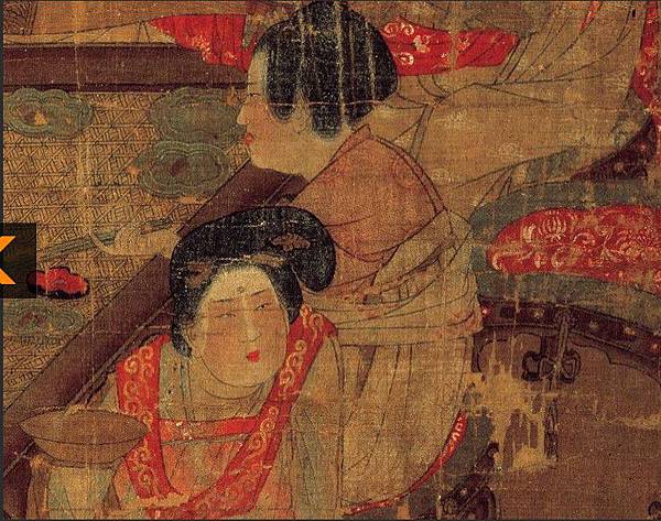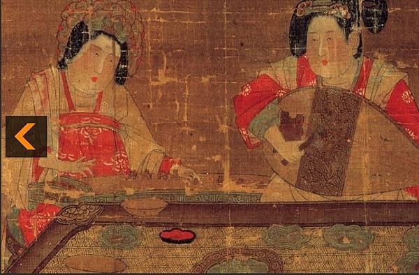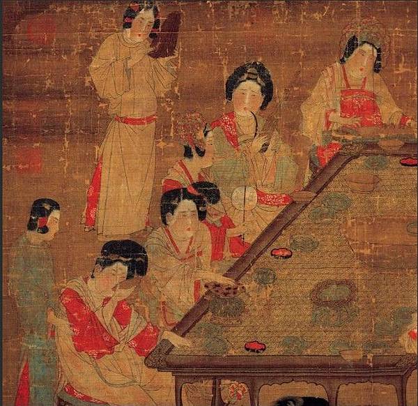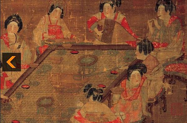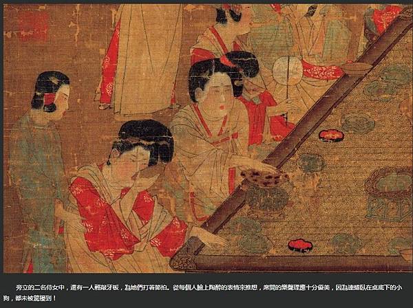 這四個演奏樂器的宮女,其實應該是為另外幾個宮女「助興」,她們正在喝茶、吃點心,可能都閒來沒事,無聊便談談後宮的八卦吧!另外,旁邊還有兩個侍女,畫家的安排是,上方穿白方的侍女,正在敲著「牙板」,為演奏樂器的宮女打節拍。下方穿綠衣的侍女,用手扶住左下角那個宮女,大概宮女喝醉了吧!