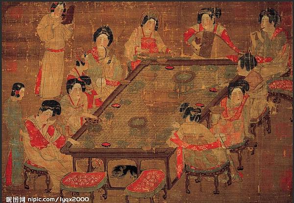 本圖描寫後宮嬪妃十人,圍坐於一張巨型的方桌四周,有的品茗,也有的在行酒令。中央四人,則負責吹樂助興。所持用的樂器,自右而左,分別為篳篥、琵琶、古箏與笙。旁立的二名侍女中,還有一人輕敲牙板,為她們打著節拍。從每個人臉上陶醉的表情來推想,席間的樂聲理應十分優美,因為連蜷卧在桌底下的小狗,都未被驚擾到!
