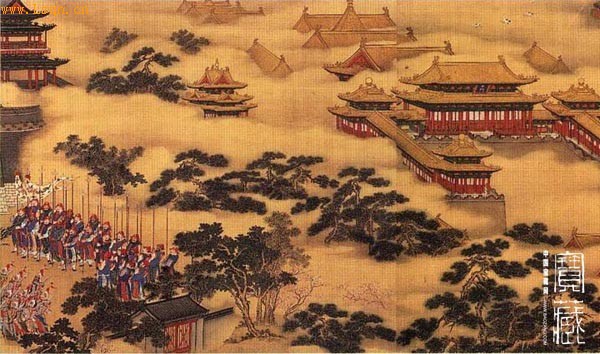 《出警入蹕圖》局部 雲霧繚繞中的宮殿和列隊的儀仗