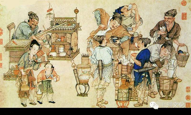 生產一旦專業化、集中化、規模化,就還需要有通暢的銷售渠道。像大店鋪主要經營批發業務,它們的業務對象,是“客販”,即商人,而非零散顧客。至於讓這些貨品到達一家一戶,則還要靠手推肩扛的貨郎們。如《武林舊事》“作坊”一條中,談到南宋杭州的風氣:“凡買賣之物,多與作坊行販已成之物,轉求什一之利。或有貧而願者,凡貨物盤架之類,一切取辦於作坊,至晚始以所直償之。”生產的繁榮,社會購買力的旺盛,都使得從作坊那裡批發現成物品轉手出售,在當時成了很常見的行當。對於連躉貨的本錢也沒有的貧窮者,作坊甚至願意提供貨物和銷售工具,讓他去游動售貨,待貨售出後再行清算,因為這樣對生產方也有利。這就是我們眼前這位貨郎之所以產生的時代背景,閃爍在這位淳樸貨郎身上的,是宋代社會發達的商品生產和商業文明的影子。