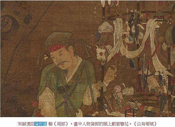 宋蘇漢臣貨郎圖 軸(局部),畫中人物貨郎的頭上戴著簪花。(公有領域)