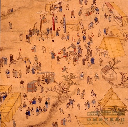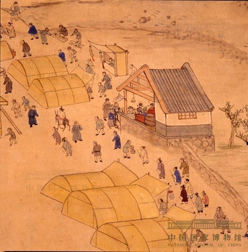 只有個別在棚外搭灶,其上置長嘴高炳的大茶湯壺,供應開水。另外幾個涼棚式的茶棚,內擺長桌條凳,供香客歇腳品茶。儘管茶棚、茶攤的建築形式都十分簡陋,但仍擠滿了香客。其中還有不少進香者川流不息地頻於各個棚內出入。可見茶棚、茶攤其數量之多,在《進香圖》中是佔有突出地位的。