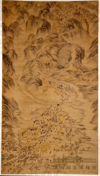 民俗學是一門古老的學科,也是一門新興的學科。中國古代保留了許多民俗學方面的資料,這些資料不少保留在文獻、繪畫中。在中國歷史博物館的藏品中,就有清人無名氏繪製的《妙峰山進香圖》(以下簡稱《進香圖》),這是一件反映清代後期北京妙峰山廟會的民俗繪畫作品。該圖為紙本設色,無款,縱205.5厘米,橫114.6厘米。圖中巧妙地運用了寫實記事的手法,採用工筆淡彩,細膩生動地描繪了人們在春風和煦時節,前往妙峰山進香的盛況。此圖雖非出自名家之手,但是,能樸實而又形像地描繪北京妙峰山的山勢風光,廟宇建築,朝香風俗的繪畫,還是不可多得的。