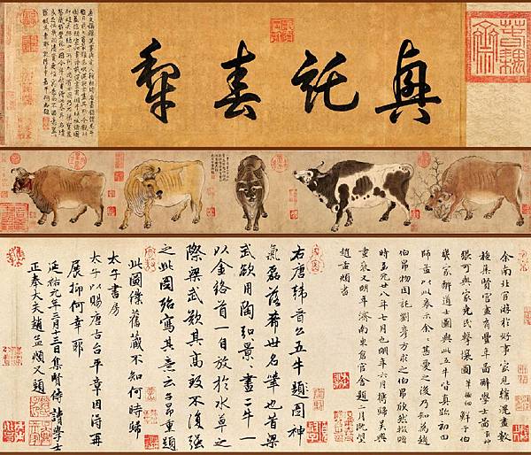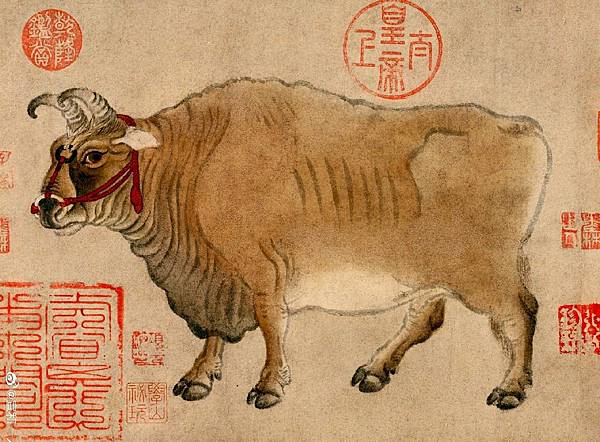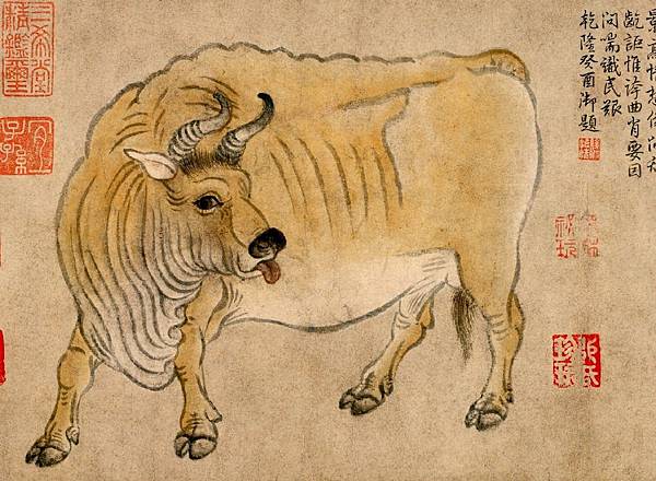 筆者認為,乾隆皇帝的題詩比較客觀的道出了韓滉的創作意圖:「一牛絡首四牛閒」,是講韓滉的五個兄弟中只有韓滉一位在朝為官,其他都已賦閒林下。「弘景高情想像間」,「弘景」當然是指陶弘景;這句說:陶弘景的清高只是一種理想之境界並不足取。「舐(shi)齕(he)詎惟誇曲肖,要因問喘識民艱」這兩句包含了「丙吉問喘」的典故:丙吉是漢宣帝時的丞相。據說有一次出門,在路上看見一群人鬥毆,死的傷的,躺在路上橫七豎八的。丙吉不聞不問,驅車而過。走不多遠,當他看見有一頭牛在張嘴喘氣,卻停下車來,派人去問那趕牛的人:『那頭牛走了幾里路了?』他的隨從譏笑他,說他不問大事卻關心小事,所以失當。丙吉卻嚴肅的對他們說:百姓鬥毆,這是當地地方官該管的事。做為丞相,沒必要親自去管。而現在是春天,天氣還不該太熱,如果那頭牛走不多遠就喘氣,說明天氣不該熱而熱,這就意味著氣候失調了,這樣對農作物的收成影響就大了,這是全局性的問題,也是使人憂慮的大事。因此,乾隆皇帝絕句中的後兩句大意是:韓滉和丙吉兩位先朝的丞相都能從大處考慮,真正的關心老百姓的疾苦。
