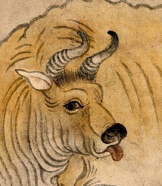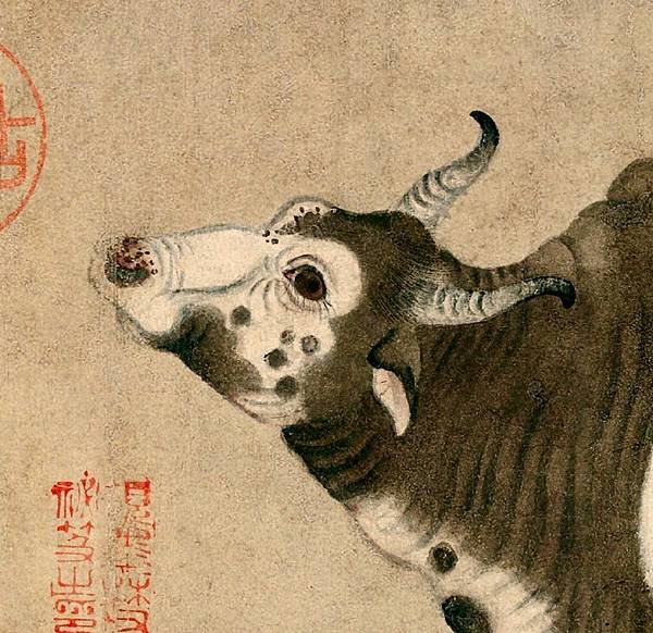 五牛目光炯炯,深邃傳神,將牛既溫順又倔強的性格表現得淋漓盡致。畫者著重刻畫牛的眼睛及眼眶周圍的皺紋,還用尖細勁利的筆觸細心描繪了五牛眼眶邊緣的睫毛,通過細節的刻畫,把每頭牛獨具的個性加以強調,使它們鮮明地顯示出各自不同的神情。觀者分明能感覺到這五頭牛不但有生命、有情感,而且有各自不同的內心世界,這是人格化了的五牛。
