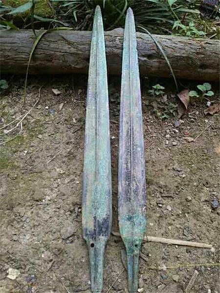 重慶晚報報導,永州居民彭波日前拆除百年老房子,竟在石櫃裡發現兩把「寶劍」,劍長約55公分,兩頭窄中間寬,最寬處約5公分,最窄處約2公分,重約0.5公斤;劍體呈藍綠色,中間有些地方呈灰黑色,刀刃比較鋒利,劍身上疑有老虎形狀的圖騰。
