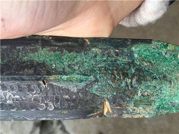 二是劍身呈黑色的地方為黑漆古,黑漆古是由於古銅長期存放在潮濕的地方,其表面生成的一層極穩定的保護薄膜,重慶地區潮濕,劍身有黑漆古出現是合乎常理的;三是劍有一小塊破損的地方,所裸露出來的青銅顏色很純正,當時的青銅大多都是呈黃金的顏色。