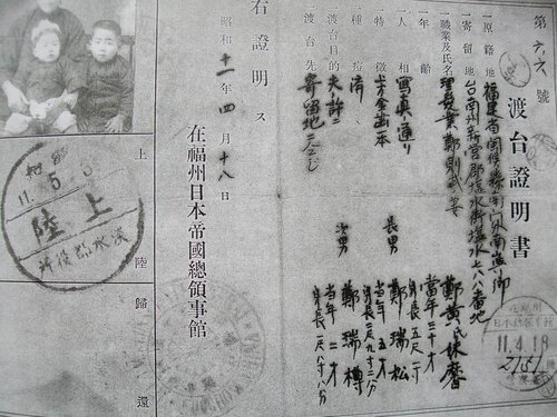 摘要導言這是日本總領事館簽發的「渡台證明書」,證明書中不但載明持有人妻室,子女姓名、年歲,連身高都有,證明書持有人即照片中的大人鄭則武,他當時是到鹽水來接替哥哥理髮店,除了大哥、他自己,他們的三弟鄭瑞杰也是從事理髮的,現今坐落在鹽水鎮三福路的理髮老店,已有九十年的歷史。圖中被抱著的小孩就是照片提供人鄭瑞樽,今年也已六十五歲了。