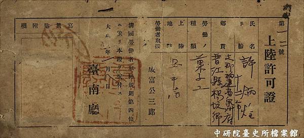 許炳煌(1901-1967),臺南市人,臺南三郊(北郊、南郊與糖郊)組合長景祥號許藏春之孫。清代臺灣的商業團體臺南三郊面對政權更迭,1895年起成員陸續內渡中國,直到局勢穩定後,才紛紛回到臺灣重新經營生意。大正年間,籍貫福建省泉州府晉江縣12歲的許炳煌,持臺南廳所發上陸許可證,以菓子工身分於安平港上陸,顯示其從中國來到臺灣的足跡。(圖1)1926年9月,許炳煌創設益泰商行,經營山產雜貨買賣貿易,如益泰商行就曾代理發售香港廣其昌的各式紙料。(圖2)依1930年5月「臺灣總督府旅券發行簿」中臺南州的紀錄,得以窺見許炳煌為從事「雜貨仕入」,就曾前往廈門和香港兩地。戰後,益泰商行轉型,改為專營焦炭事業,約1991年正式結束營業。