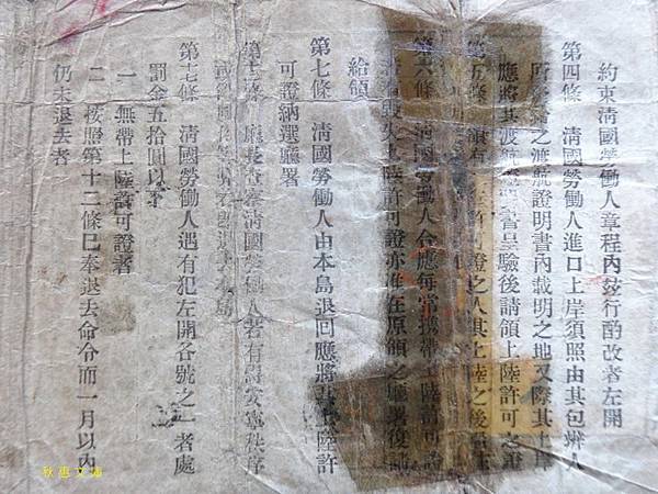 由戰前日本東京府藏清國及臺灣相關公文書來觀察,1874年4月10日通過的〈在留清國人民籍牌規則〉中,因日本政府將對國內各港口越漸增加的中國民眾實施管理,採行登錄制度。從中國來到日本的民眾,必須在抵達港口的三日內提出籍牌申請,依據職業而區分為上、下兩等,買辦商人等家業豐厚者為上等,雇傭工人等收入微薄者為下等。從圖1所揭示的申請書式樣來看,是以男性為主要申請人,妻、子、奴、婢等皆附屬於男性之下,中間的家眷牌圖示也顯示女性的眷屬身份,而非個人自身。另外,申請籍牌需要繳付一定金額的手續費,籍牌規則中並規定未滿16歲之男女及已婚婦女,僅需繳納一半的手續費,同樣顯示了女性依從男性存在的地位。
