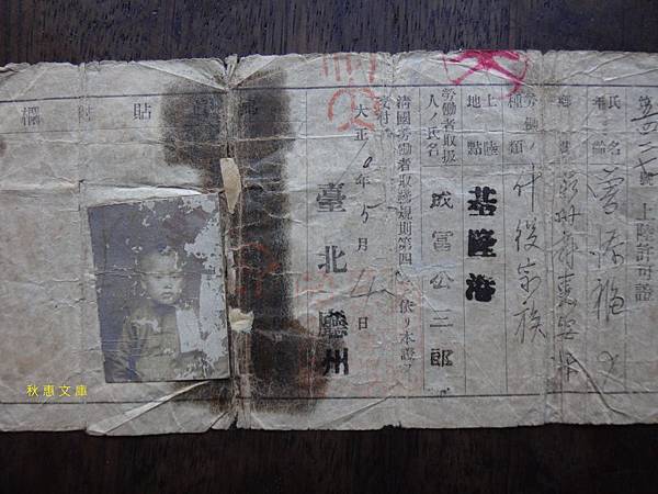 再從臺南文峰茶莊陳家文書來看,陳家先祖於清同治年間,由福建泉州府移民來臺,定居於枋橋頭(今臺南市)。開基祖陳錦雲經營文峰茶莊,初創業時經常往返廈門採辦買貨。圖2為1896年陳吳氏作為陳家第二代陳登志的眷屬回鄉祭祖,從廈門搭乘英國爹利士輪船前往臺灣安平,持此護照作為臺灣地方官廳驗照放行的憑據。當時臺灣已由日本政府治理,往來臺、廈之間必須繳驗身份及出入境原因,方能順利往返。畫面右側的騎縫字,即是海關查驗身份時的憑證,陳吳氏回到廈門之後,護照上的騎縫字需與廈門海關留存的護照能夠相契合,以驗證其身份無誤。文件中並未記載陳吳氏之姓名,僅以眷屬身份而存在。