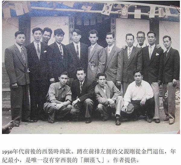 1950年代前後的西裝時尚款。蹲在前排左側的父親剛從金門退伍,年紀最小,是唯一沒有穿西裝的「細漢ㄟ」。作者提供。