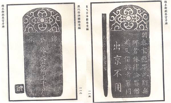 另一方面,作為重要參考的錦衣衛象牙牌,羅振玉編的《歷代符牌圖錄》是為非常重要的依據,且收錄的錦衣衛象牙牌亦有五枚之多,對本次研究起重大用途。