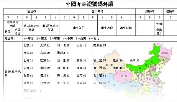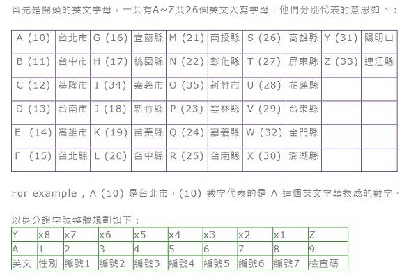 2是女生); 第3碼~第9碼是順序碼; 第1碼英文字母是戶籍地; A臺北市 B台中市 C基隆市 D台南市 E高雄市 F臺北縣 G宜蘭縣 H桃園縣 I嘉義市 J新竹縣 K苗栗縣 L台中縣 M南投縣 N彰化縣 O新竹市 P雲林縣 Q嘉義縣 R台南縣 S高雄縣 T屏東縣 U花蓮縣
