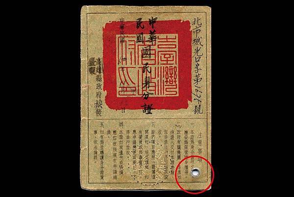 1954年起,第二代身分證使用雞眼釘,以達防偽目的。 ©臺中市豐原區戶政事務所