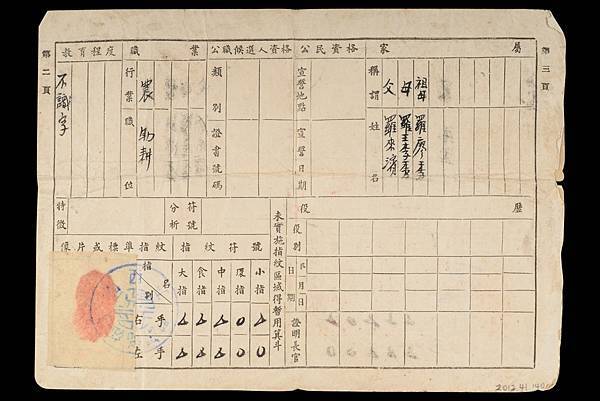 早年身分證的指紋符號欄。若指頭的紋路類似同心圓的「斗」狀紋,就用「○」來記錄,如果是有如畚箕紋路狀的「箕」狀紋,就用「△」或「Ⅴ」來記錄。©國立臺灣歷史博物館