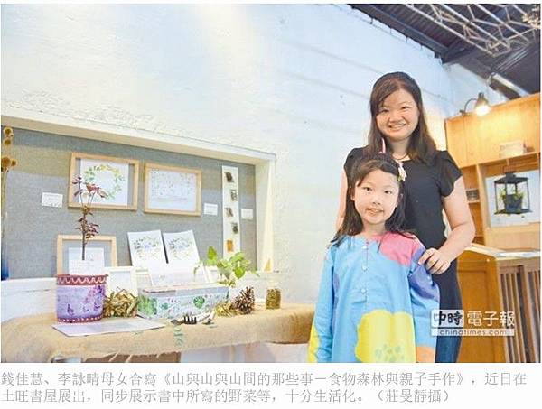 錢佳慧、李詠晴母女合寫《山與山與山間的那些事-食物森林與親子手作》,近日在土旺書屋展出,同步展示書中所寫的野菜等,十分生活化。(莊旻靜攝)