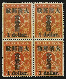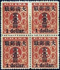 紅印花「小字當壹圓」四方連號稱「東半球最罕貴華郵」,原為海關費拉爾收藏、秘不示人,1904年費拉爾去世後,由他的妻子繼續珍藏著,直到1924才方為人知,當時上海英國籍郵商施開甲得知後,通知集郵家周金覺向費氏遺孀遊說,費盡周折以2500兩紋銀獲得,之後幾經轉手,1980年代,香港集郵家林文琰以30萬美元購入,2010年4月再轉讓給中國上海集郵家丁勁松珍藏,預估價值近新台幣5億,丁勁松也因此被封為「郵王」。