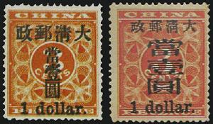 紅印花第一種加蓋“當壹圓”票,據說只加蓋了兩整張(每張25枚),計50枚。郵政當局嫌加蓋字體過小,決定改用大字“當壹圓”字模,故加蓋小字的稱為紅印花加蓋小字當壹圓。已發現存世僅32枚。其中有四方連1件,橫雙連1件,其餘為單枚。信銷票僅1枚,乃世界孤品。有2種珍貴的變異票,即加蓋英文“dollar”後面沒有句點“.”和有遠距離句點。