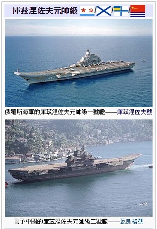 庫茲涅佐夫號航空母艦,是俄羅斯現役最新型的航空母艦,在蘇聯時期建造,蘇俄計劃號碼為1143.5號計劃重型航空巡洋艦,於1983年開工建造,在建造過程中吸收了約800個學科的專家參加,7000多家工廠提供了材料和設備,可謂集蘇聯科技發展大成之作。該艦建造時期原名蘇聯號、克里姆林宮號、布里茲涅夫號、第比利斯號,1991年服役時易名庫茲涅佐夫號,舷號063。和其他俄制航空母艦一樣兼具巡洋艦的武裝,扣除艦載機仍有相當強大的戰鬥力量。現部署於北方艦隊,是俄羅斯唯一一艘航空母艦。