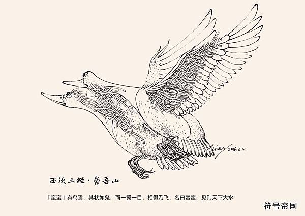 《西山經》中"崇吾之山有鳥焉,其狀如鳧,而一翼一目,相得乃飛,名曰蠻蠻,見則天下大水。"