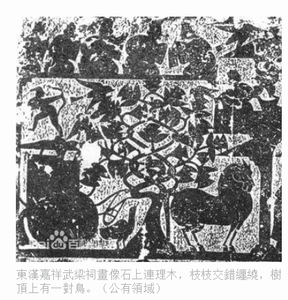東漢嘉祥武梁祠畫像石上連理木,枝枝交錯纏繞,樹頂上有一對鳥。(公有領域)