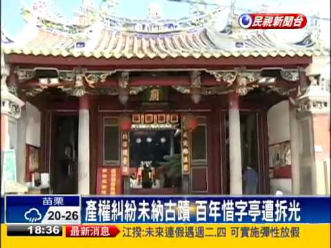 未料,民宅屋主今日拆掉老屋,連同惜字亭一併拆掉成廢磚土;黃姓屋主堅稱,該處屬民宅私地,惜字亭非指定古蹟,如果是廟產地,多年前廟方地籍鑑界早就屬廟方,由於百年老屋殘破不堪才雇工拆掉。