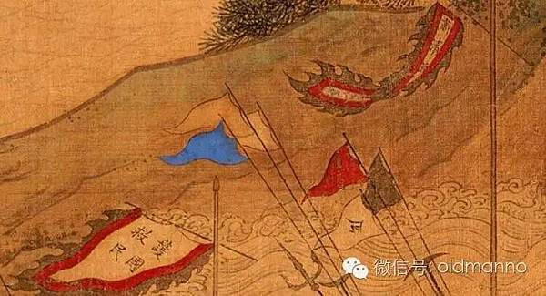 從旗幟上來看,左邊船上的應是明軍水師,右邊兩條船上的即為倭寇。