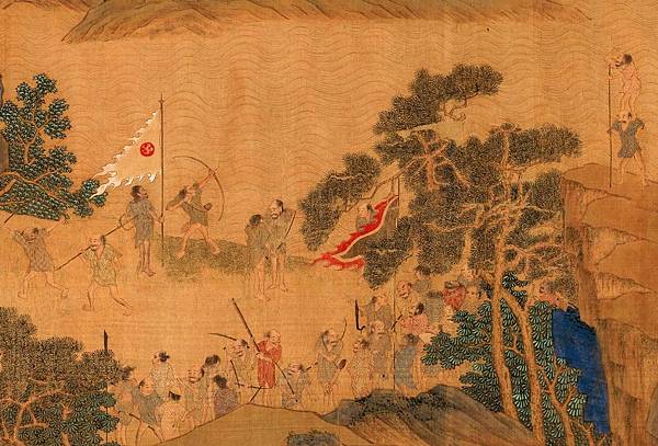 《抗倭圖卷迎接獻俘》的後半部可以看到,有3名倭人在戰敗後被高舉“浙直文武官僚”旗幟的明軍總督的部隊俘獲帶走。