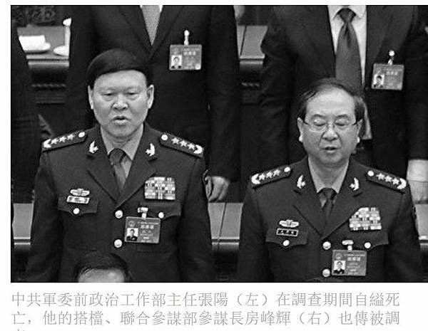 據報導,張陽被查的同時,他的「老搭檔」、中共中央軍事委員會聯合參謀部參謀長房峰輝也在差不多的時間被調查。#