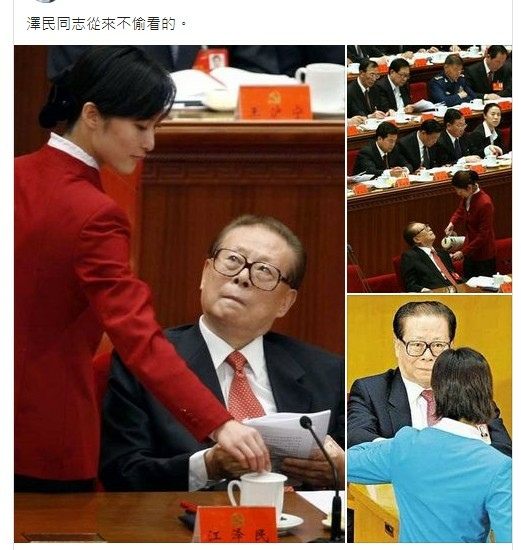 林智群律師以:「澤民同志從來不偷看的。」為題,貼上三張照片,其中都可看到江澤民對於服務的女性都投以奇怪的眼光,甚至直接抬頭看,正大光明從不掩飾自己的「色心」,魂不守舍的模樣全見光。