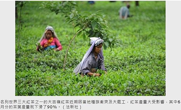 外媒早先報導,印度東部西孟加拉邦的大吉嶺(Darjeeling)茶區,是在喜馬拉雅山下的區域,每年產茶大約1萬噸,是享有盛譽的紅茶產地,但近期因當地的原住民廓爾喀族(Gorka)及孟加拉族起衝突,廓爾喀民族採取激烈手段發起罷工,過程中也造成多人死傷。