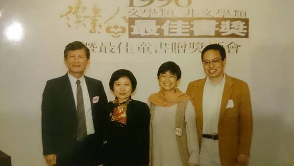 「「讀書人」年度好書頒獎合影。左起楊老師伉儷,遠流台灣館副總編輯,我的師父黃盛璘,最右邊的我也難得穿著整齊。」