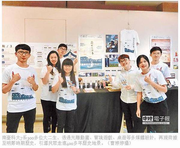 南臺科大教學卓越計畫銜接高教深耕創新教學,整合視傳系商設組、動畫組及創設組、多樂系與商管學院電商、工管、企管約300位大二生,走訪台江及周邊人文景點,並考據歷史,花一學期完成「讓台南古地圖活起來」共50幾件作品,最終將選出3組,10月於鹿耳社區推出實境遊戲與歷史體驗市集,12月配合台灣歷史博物館古地圖展持續展出。