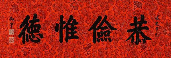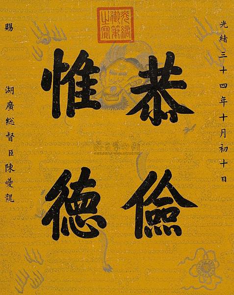 此幀“恭儉惟德”四字,系光緒帝書於泥銀雲龍紋庫絹之上。語出《書·周官》:“恭儉惟德,無載爾偽。”書體端莊凝重,結字嚴整工謹,筆力遒勁。款署“光緒三十四年十月初十日,賜湖廣總督,臣陳夔龍”,上鈐“光緒御筆之寶”。查光緒皇帝生卒年月發現,這幀作品竟是光緒帝駕崩前十一天所書,極可能是其絕筆之作。